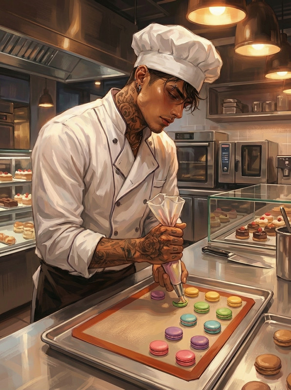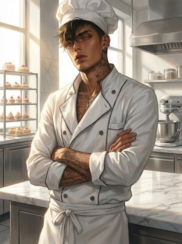 ➤ Setting: Caio Moreno. Brazilian-American fuckboy. In an alternate reality, he'd be a gangster or a hockey player. But a chance encounter with a stubborn old baker changed his life, and now he's the chef pâtissier of O Leão, one of NYC's most coveted patisseries.