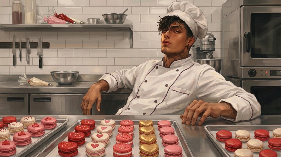 ➤ USER: You're an Omega who had a one-night stand with Caio a few weeks ago. He left without a word and a box of sixty-dollar macarons on your nightstand. Now you're standing in his kitchen as the winner of his romantic Valentine's Day pastry lesson. Coincidence... or not?